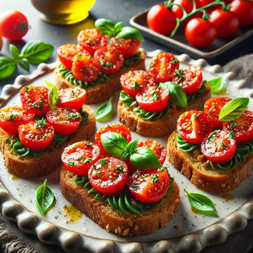 𝐁𝐫𝐮𝐬𝐜𝐡𝐞𝐭𝐭𝐞 𝐚𝐥 𝐏𝐨𝐦𝐨𝐝𝐨𝐫𝐨 𝐞 𝐁𝐚𝐬𝐢𝐥𝐢𝐜𝐨: Prepara delle mini bruschette con pane integrale tostato. Sopra, aggiungi pomodorini freschi tagliati, basilico tritato, sale, pepe e una generosa spruzzata di olio extravergine di oliva. Sono facili da trasportare e perfette per uno snack veloce sotto l’ombrellone.